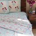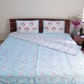 Bring home elegance and comfort with this beautifully handblock-printed dohar set. Designed in soothing shades of sky blue with intricate floral motifs, this dohar exudes a refreshing charm that instantly brightens up your bedroom. Crafted from soft, breathable cotton, it ensures cozy warmth without feeling heavy, making it perfect for all-season use. The set comes with matching pillow covers featuring vibrant red floral prints that add a touch of contrast and sophistication. Lightweight, stylish, and easy to maintain, this dohar set is a perfect blend of tradition and modern comfort for your home.