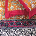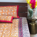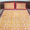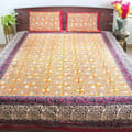 Bring a touch of traditional charm to your bedroom with this stunning Kalamkari Mustard Paisley Blossom Bedsheet. Featuring intricate white floral and paisley motifs on a rich mustard base, this bedsheet is bordered with contrasting red and indigo floral patterns, exuding ethnic elegance. Made from soft cotton fabric, it offers both comfort and aesthetic appeal. Ideal for enhancing your space with a warm, handcrafted vibe. Comes with matching pillow covers for a complete look.
