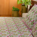 Bring home a refreshing burst of nature with the Garden Charm Bedsheet. Featuring a beautifully balanced pattern of leafy green motifs and soft golden florals set against a soothing beige base, this design evokes the calm elegance of a vintage garden. Delicate red buds add a cheerful pop of color, while the repetitive, symmetrical layout creates a serene and organized feel. Made from soft, breathable cotton, it's perfect for everyday comfort with a touch of timeless style. A charming choice for those who love earthy tones and classic Indian prints.