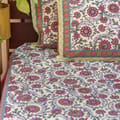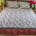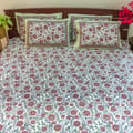 The Firdaus Floral Printed Bedsheet brings a touch of timeless elegance to your bedroom. Featuring intricate floral motifs in rich shades of maroon, pink, and lavender, set against a soothing off-white base, this bedsheet exudes a classic, handcrafted charm. The leafy vine patterns in olive green beautifully complement the blooms, creating a harmonious and detailed block print look. Coordinated pillow covers with a vibrant green and pink border frame the design, adding structure and finesse. Perfect for those who appreciate traditional artistry blended with comfort.