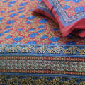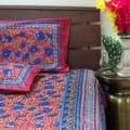Voeg 'n lewendige tikkie elegansie by jou slaapkamer met die Royal Ruby Blossom Kalamkari Bedlaken . Met 'n ingewikkelde Kalamkari-blomontwerp in treffende skakerings van blou en rooi, is hierdie bedlaken 'n viering van tradisionele kuns en vet kleur. Die ryk rooi basis word pragtig aangevul deur helderblou blomme en versierde rande, wat 'n luukse en kulturele estetika skep. Gemaak van sagte, asemhalende katoen, verseker dit gemak terwyl dit jou dekor verbeter. Perfek vir diegene wat tydlose ontwerp met 'n moderne flair waardeer.